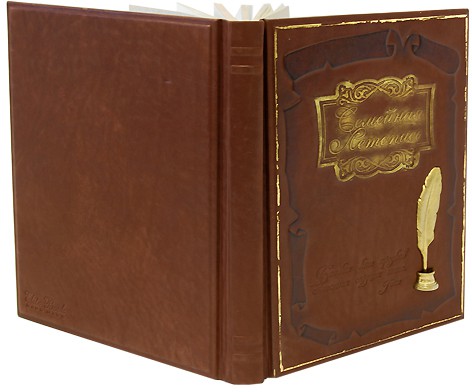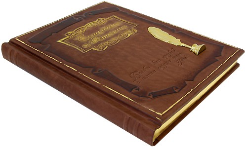Оформлення: шкіряна обкладинка, художнє лиття, тристоронній золотий обріз, ручна робота,