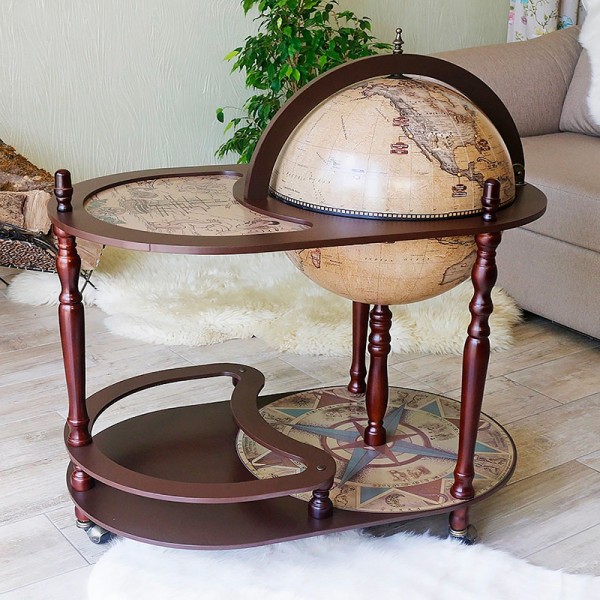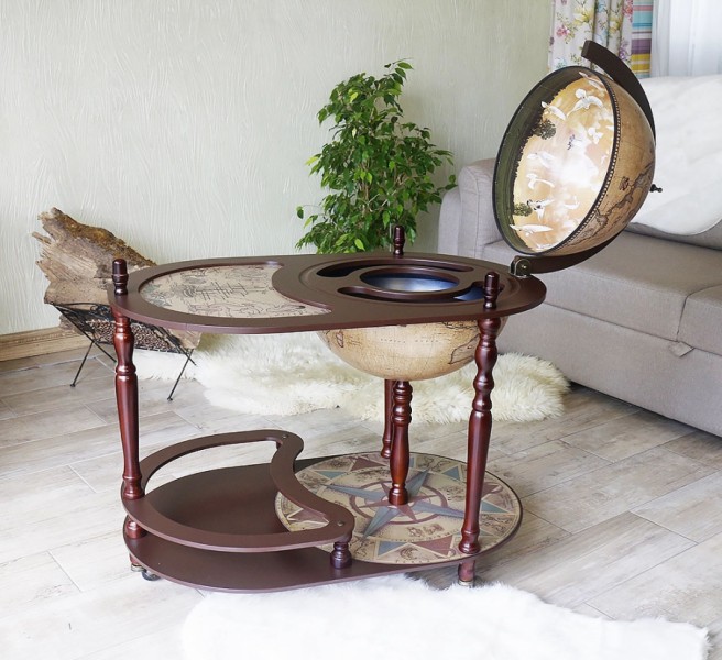 Глобус бар є розкішною деталлю інтер'єру, де можна зберігати алкогольні напої, келихи і не тільки, завдяки наявності столика глобус бар дуже функціональний і практичний, легко переміщається завдяки наявності коліс. Якість матеріалів під час виробництва та використання сучасних технологій при виробництві позитивно позначається на експлуатації та зовнішньому вигляді.