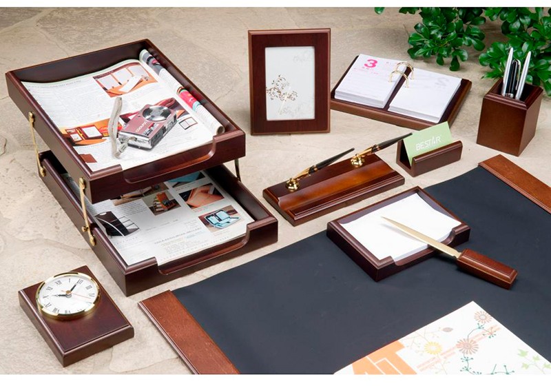 горизонтальний подвійний лоток для документів підставка під перекидний календар підставка для записів: 100х150мм ніж для розкриття кореспонденції підставка для візиток рамка для фотографії розміром 90х130мм настільний годинник.