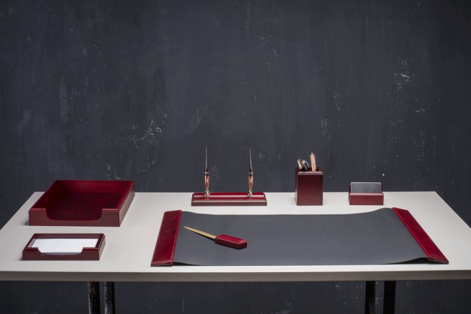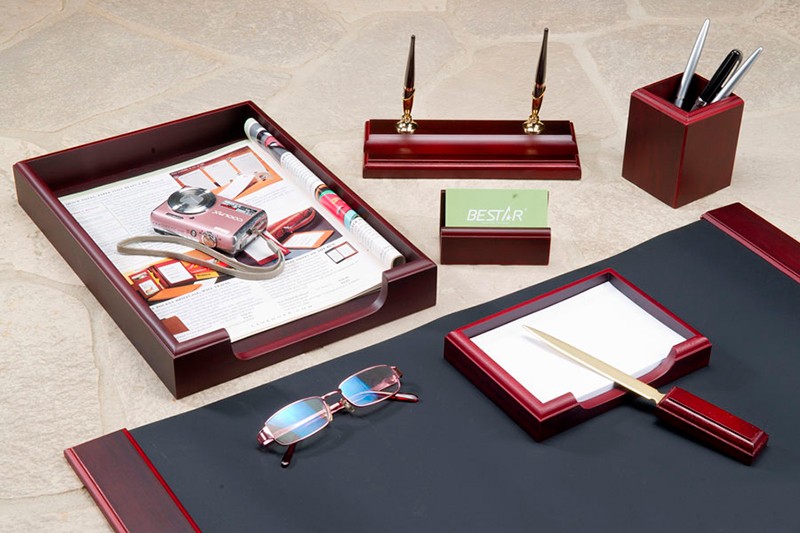 Протягом багатьох років тайванські майстри з дерева дбайливо виготовляю розкішні настільні набори торгової марки Bestar. Цей екземпляр складається з семи предметів, у тому числі в комплекті є підкладка для письма.