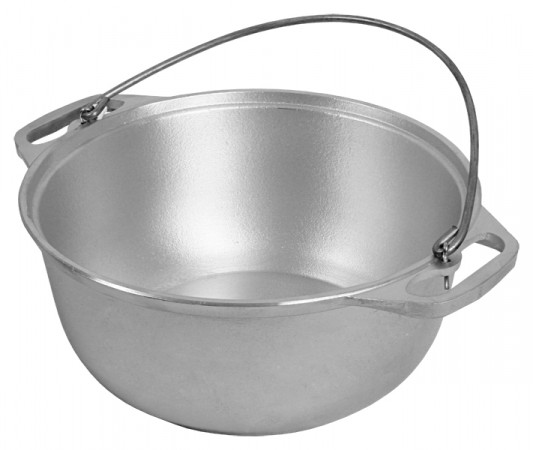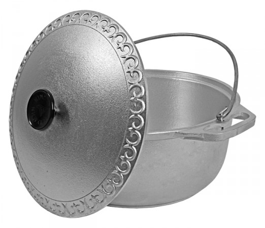 Жаростійка ручка на кришці та металева дужка для підвішування над вогнем.