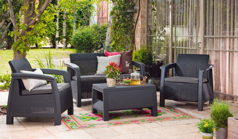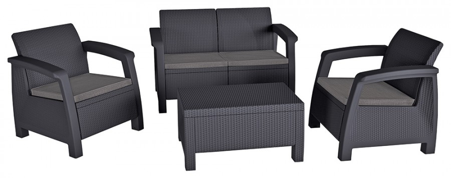 Відсутність металевих деталей гарантує відсутність іржі та довговічність. Меблі компанії Keter виготовлені з міцного атмосферостійкого пластику, який імітує ротанг. Незважаючи на те, що комплект виконаний з неметалевого каркасу, меблі стійкі, міцні і витримують велику вагу. Завдяки матеріалу - колір не вигоряє на сонці і не тьмяніє з часом. Манжети на подушках виконані із щільної тканини, також стійкою до атмосферних явищ.