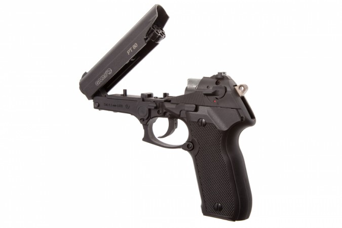 Gamo PT 80 - пневматичний газобалонний СО2 восьмизарядний пістолет, боєприпаси (кулі типу Діаболо) заряджаються в барабан-кліп, встановлений у корпусі, одного балончика вистачає приблизно на 60 пострілів.
