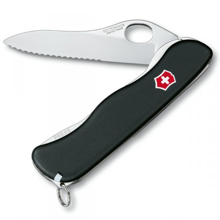 Швейцарський кишеньковий армійський ніж Victorinox Sentinel із фіксатором був розроблений за участю співробітників швидкої допомоги та МНС. Ключовим у ножі є блискавична здатність відкриватися та бути готовим до роботи. Лезо фіксується у відкритому положенні замком типу Liner-lock, а накладки на рукояті виключають ковзання в руці. Крім того, ніж Victorinox дуже практичний і містить усі основні інструменти для повсякденного життя. Ніж виготовлений із високоякісної нержавіючої сталі. Рукоятка виконана з чорного матового нейлону.