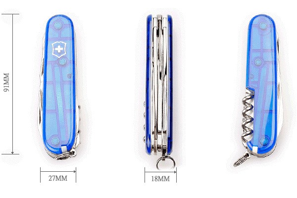 Швейцарський кишеньковий армійський ніж Victorinox. Легка, компактна та зручна модель з легкістю ляже вам у кишеню. Крім того, ніж Victorinox дуже практичний і містить усі основні інструменти для повсякденного життя. Ніж виготовлений із високоякісної нержавіючої сталі. Рукоятка виконана з напівпрозорого блакитного глянцевого нейлону з логотипом.