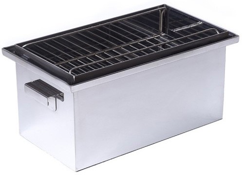 Коптильня відмінно стає на 2 конфорки газової плити. У цю коптильню легко поміщається дві курки або 4 кг курячих крил. Коптилка виконана з нержавіючої сталі, що гарантує ще триваліший термін експлуатації в порівнянні зі звичайною. Грати в даній коптильні виготовлені з харчового нержавіючого дроту діаметром від 3мм до 5мм. Завдяки товщині та міцності їх можна використовувати як грати барбекю на мангалі. Продукти гарячого копчення власного приготування виходять гарними зовні та, головне, смачними!
