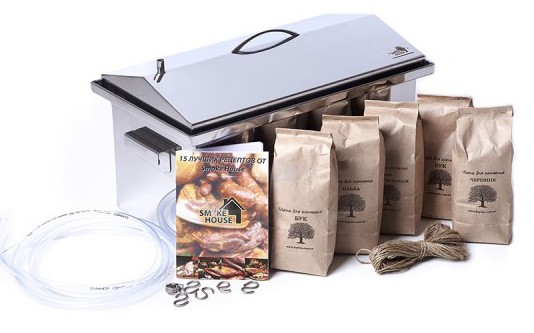 В комплект входять: 2 грати з харчової нержавіючої сталі (можна використовувати одну), піддон для стікання жиру, інструкція, тирса. Кожна коптильня в індивідуальній упаковці.