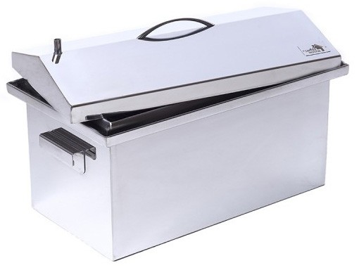 Особливість даної коптильні полягає в тому, що вона має кришку "будиночком". За рахунок цього конденсат стікає по кришці гідрозатвор і не потрапляє на продукти.
