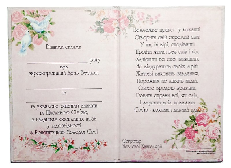 Характеристики товару Весільний диплом Конституція Молодої Сім’ї