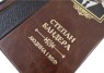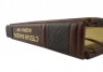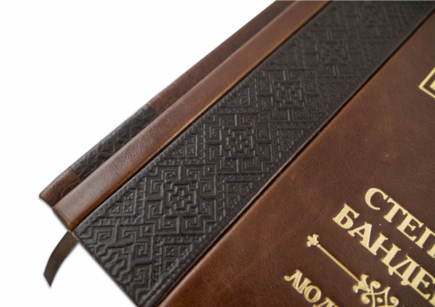 Французька складова оправа ручної роботи виготовлена з комбінації натуральної шкіри (шкіра Gabinetto Brown, шкіра Robbat Cognac, виробництва італійської шкіряної фабрики Carisma). Обкладинка книги дворівнева, вкрита вставкою з полотна, багаторівневим тисненням: глибоким блінтовим та рельєфним золотим, з використанням фольги «Luxor 240». Обріз блоку вручну полірований та позолочений сусальним золотом.