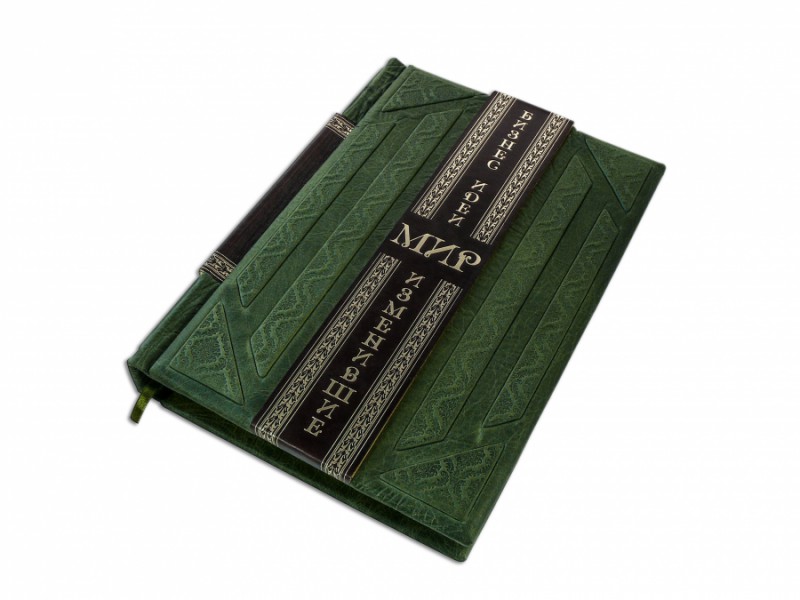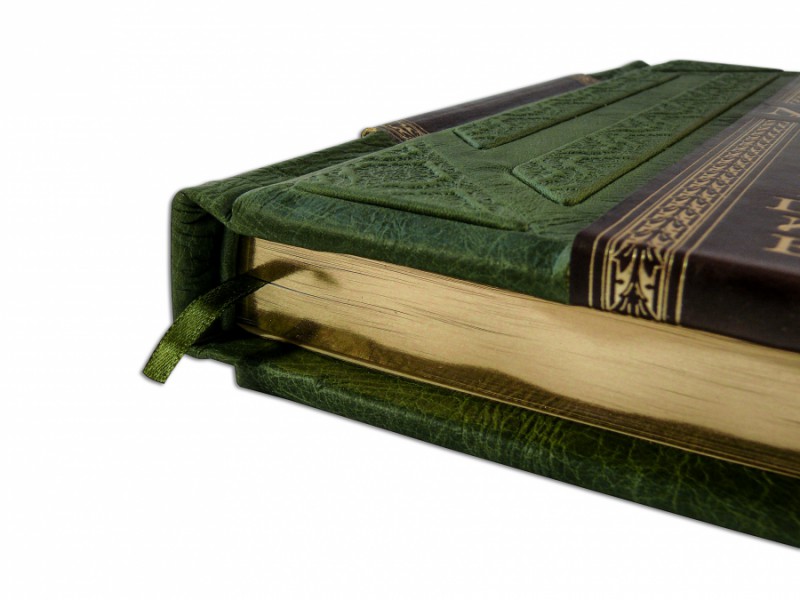 Французька складова палітурка ручної роботи виконана з комбінації натуральних шкір (шкіра теля «Robbat Wisky», шкіра «Smeraldo scuro» виробництва італійської шкіряної фабрики Carisma»). Обкладинка книги оформлена комбінацією багаторівневого об'ємного тиснення: рельєфного золотого з використанням фольги «Luxor 240» та глибокого блінтового. Обріз вручну полірований і позолочений сусальним золотом.