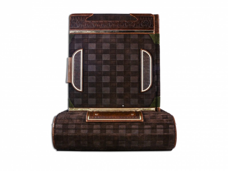 Французька складова палітурка ручної роботи виконана з комбінації натуральних шкір (шкіра «Robat Maronne», шкіра «Gabbia camoscio», шкіра «Troppopieno luminoso» виробництва італійської шкіряної фабрики «Benericetti»). Обкладинка книги дворівнева, декорована комбінацією глибокого блінтового та рельєфного золотого тиснення (використано фольгу «Luxor 240»), оформлена позолоченими ніжками (4 штуки) та латунними холітенами. Обріз блоку вручну полірований, пофарбований і позолочений червоним сусальним золотом. Підставка авторської конструкції «Бочка» декорована в стилі книги і всередині вистелена італійським коттон-оксамитом.