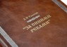 Французька цільношкіряна палітурка ручної роботи виконана з натуральної шкіри «Maronne Robbat» виробництва італійської шкіряної фабрики «Benericetti». Обкладинка книг декорована комбінацією срібного та золотого тиснення (використано фольгу «Luxor 240»). Грибоподібні коріння оформлені високими бинтами. Замшеві каптали та шовкові стрічки лясе. Обріз книг вручну полірований і позолочений сусальним золотом. У комплекті йдуть сто перший том «Зміст», 5 оксамитових чохлів, сертифікат.