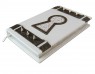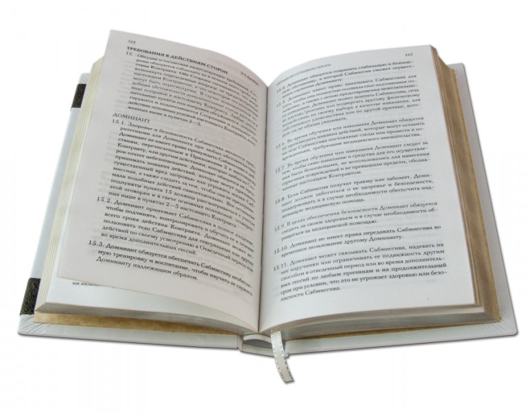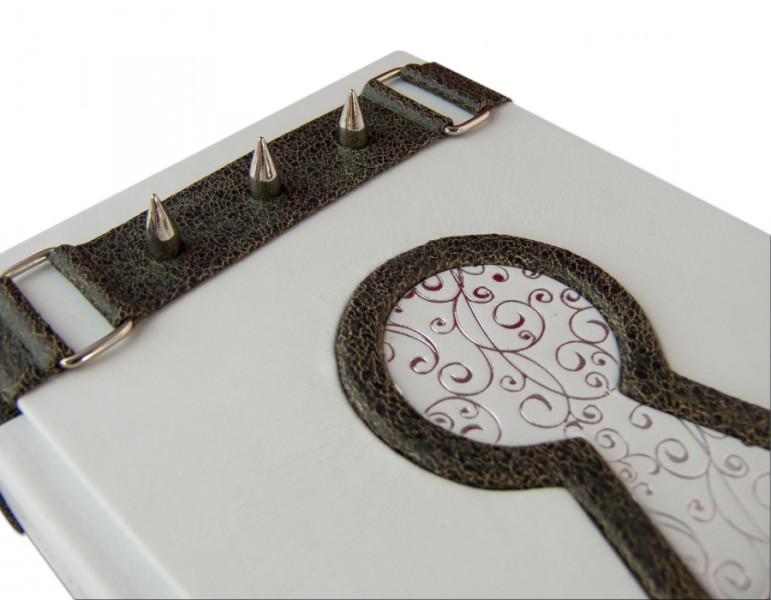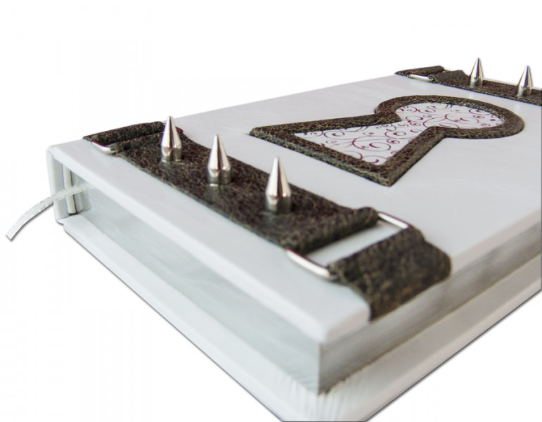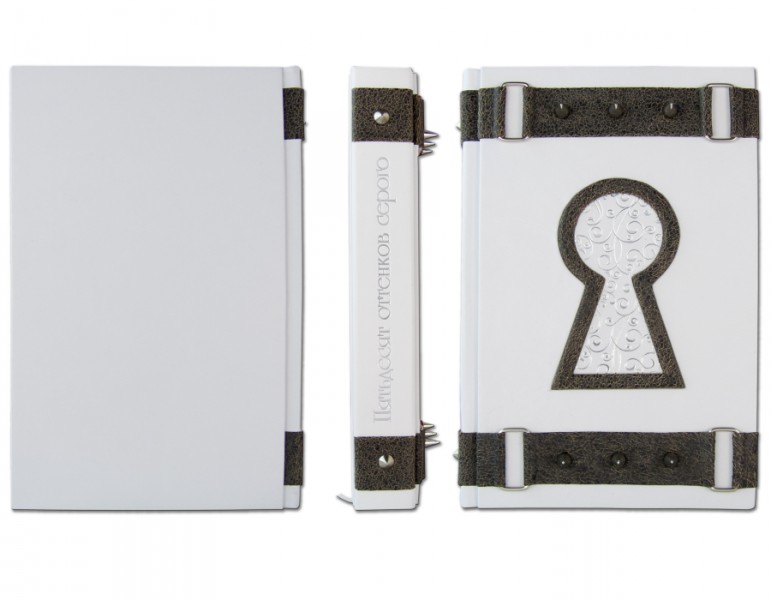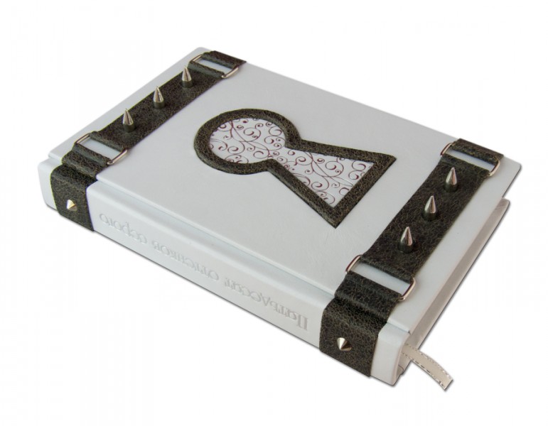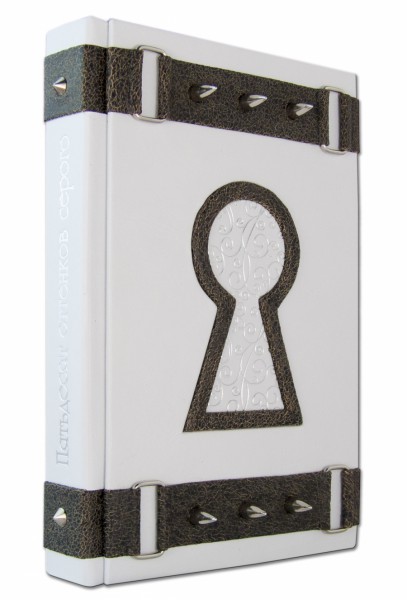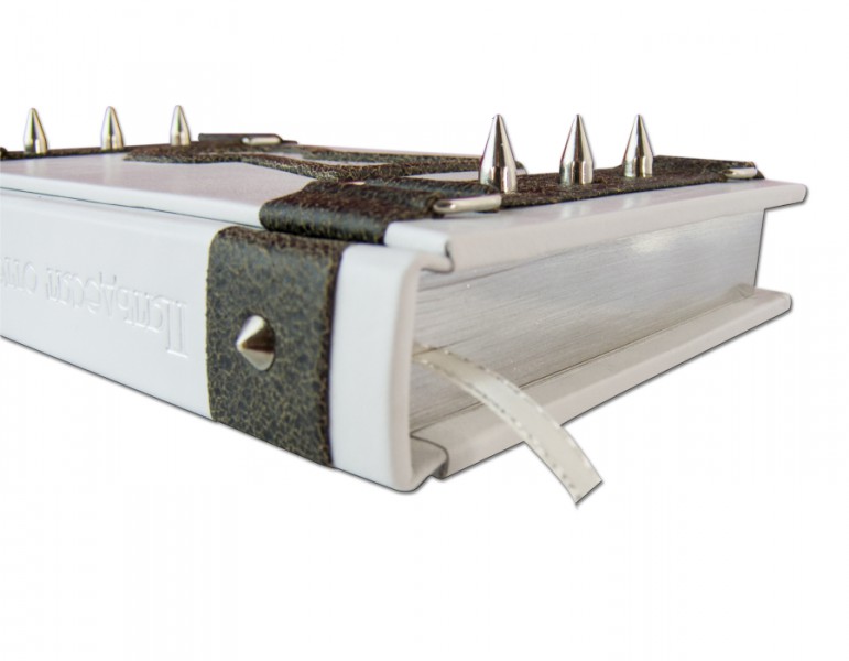 Французька складова палітурка ручної роботи виконана з натуральної шкіри виробництва італійської шкіряної фабрики «Carisma». Обкладинка дворівнева, оформлена рельєфним срібним тисненням з використанням фольги «Luxor 240». Декорована металевими пряжками (4 штуки) та шипами (8 штук). Обріз блоку вручну полірований і срібний сусальним сріблом.