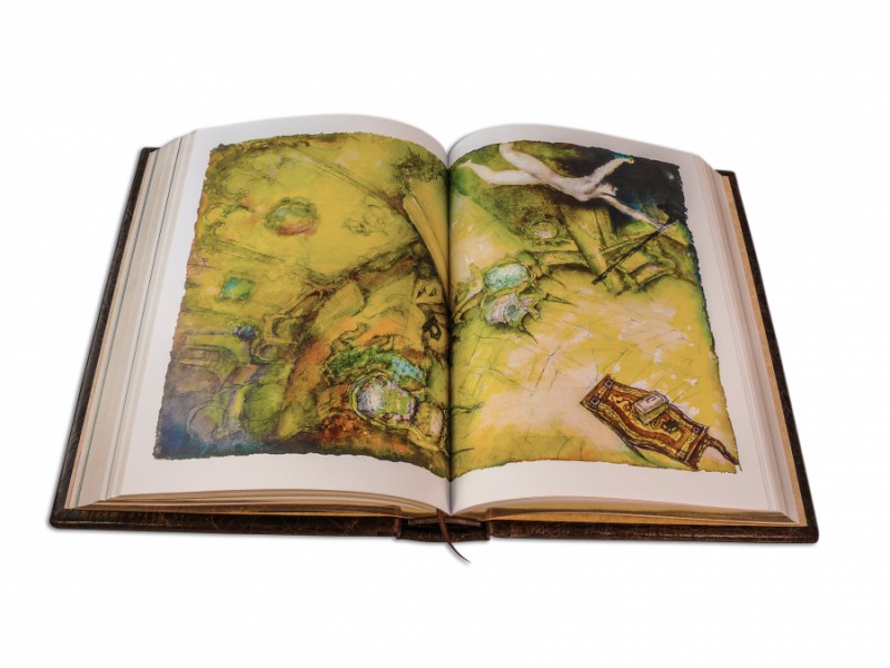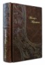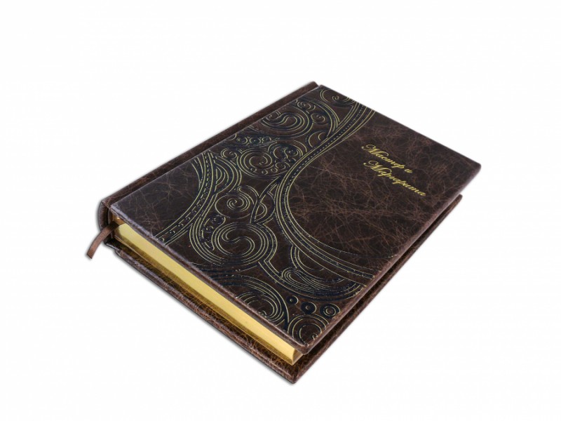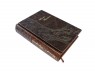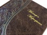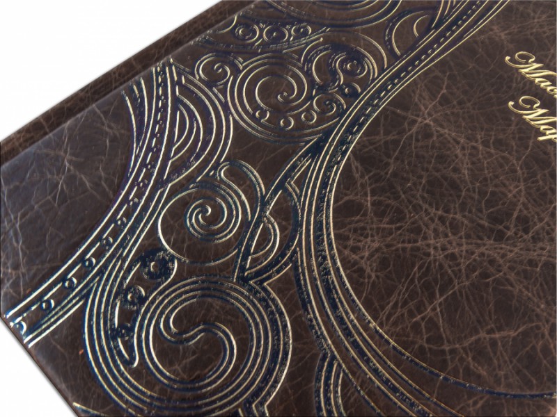 Французька складова палітурка ручної роботи виконана з натуральної шкіри «Gabinetto Brown» виробництва італійської шкіряної фабрики «Carisma». Обкладинка книги оформлена авторською технікою тиснення – хамелеон (переливається двома кольорами). Обріз блоку вручну полірований та позолочений сусальним золотом.