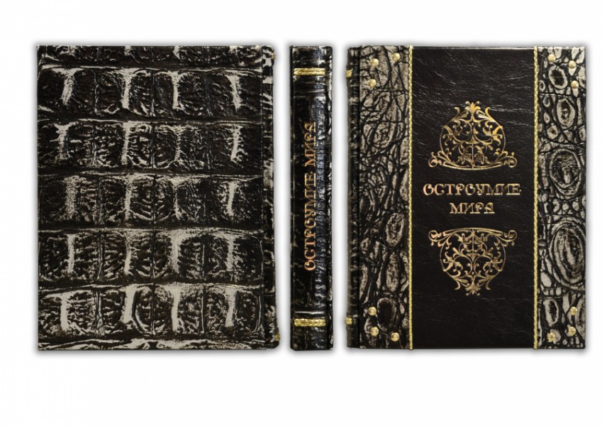 Французька складова палітурка ручної роботи виконана з комбінації натуральних шкір (шкіра «Plonge Brown», шкіра «Argento dinosauro» виробництва італійської шкіряної фабрики «Claudio»). Обкладинка книжки дворівнева, оформлена рельєфним золотим тисненням (фольга "Luxor 240"), вставками із плетеного шкіряного шпагату (колір "Gold"), латунними холітенами, кількістю 12 штук. Обріз вручну полірований і позолочений сусальним золотом.