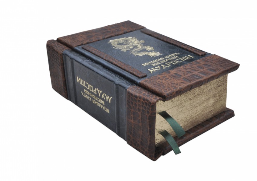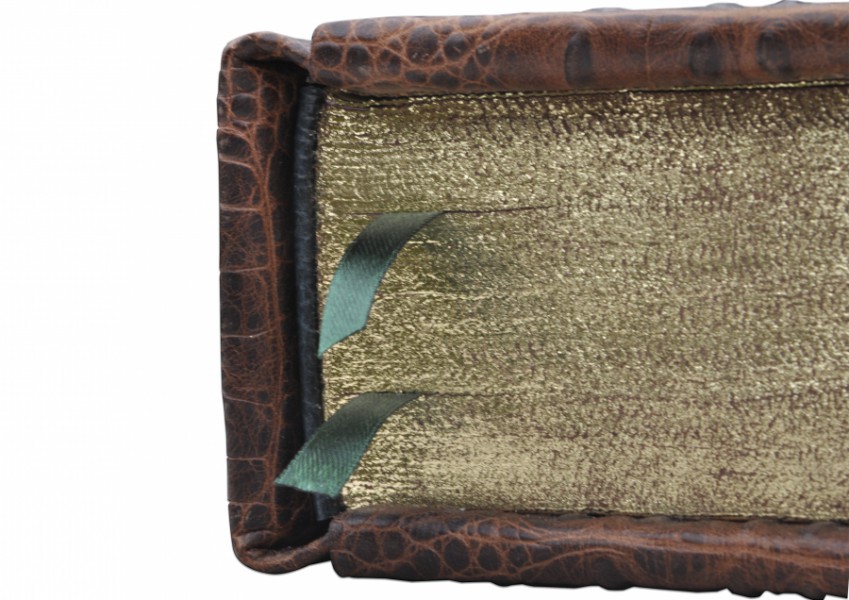 Французька складова палітурка ручної роботи виконана з комбінації натуральної шкіри (шкіра «Marone azzuro», шкіра «Drago in rilievo» виробництва італійської шкіряної фабрики «Claudio»). Дворівнева обкладинка книги оформлена рельєфним золотим тисненням (використано фольгу «Luxor 240»). Обріз книги оформлений в унікальній техніці «Хамелеон» із використанням сусального золота.