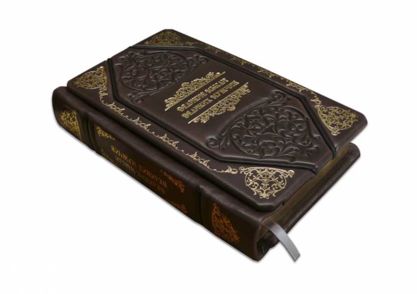 Французька складова палітурка ручної роботи виконана з комбінації натуральних шкір (шкіра теля «Robbat Wisky», шкіра «Asfalto Polveroso» виробництва італійської шкіряної фабрики Carisma»). Обкладинка книги оформлена об'ємними візерунками ручного тиснення, рельєфним золотим тисненням з використанням фольги «Luxor 240». Обріз вручну полірований і позолочений сусальним золотом. У комплекті оксамитовий чохол. Тираж – 10 палітурних екземплярів. Сертифікат