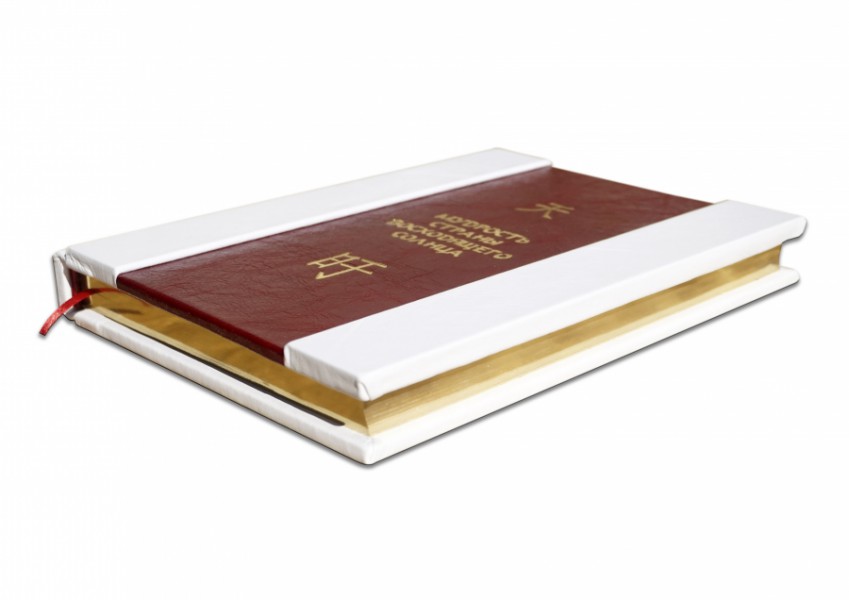 Французька складова палітурка ручної роботи виконана з комбінації натуральних шкір (шкіра «Bruno-rossastro», шкіра «Sabbia grigia» виробництва італійської шкіряної фабрики «Benericetti»). Обкладинка книги дворівнева оформлена рельєфним золотим тисненням з використанням фольги «Luxor 240». Обріз блоку вручну полірований та позолочений сусальним золотом.