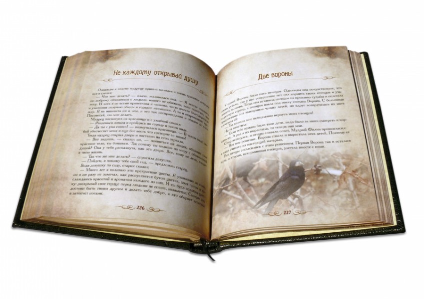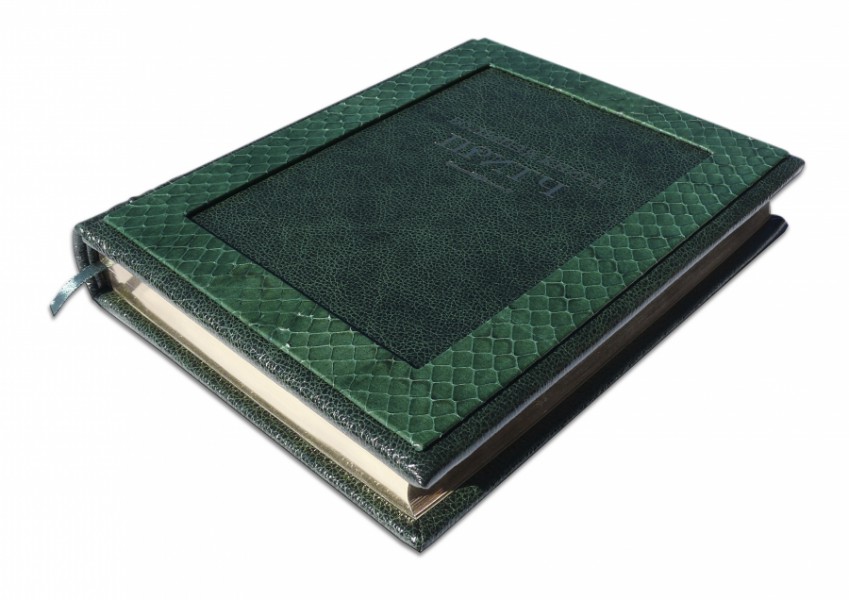 Французька складова палітурка ручної роботи виготовлена з комбінації натуральної шкіри (шкіра «Marma green», шкіра морської змії виробництва італійської шкіряної фабрики «Benericetti»). Обкладинка книги оформлена рельєфним золотим тисненням. Обріз блоку вручну полірований та позолочений сусальним золотом.