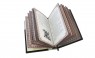 Французька складова палітурка ручної роботи виконана з комбінації натуральних шкір (шкіри «Marrone», шкіри «Smalto» виробництва італійської шкіряної фабрики «Carisma»). Дворівнева обкладинка книги, оформлена срібним тисненням, з використанням фольги «Luxor 240». Обріз блоку позолочений авторської техніки «Хамелеон».
