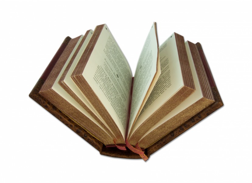 Французька складова палітурка ручної роботи виконана з комбінації натуральної шкіри (шкіра «Robbatrossa», шкіра «Dragoinrilievo» виробництва італійської шкіряної фабрики «Benericetti»). Обріз книги оформлений в унікальній техніці «Хамелеон» із використанням сусального золота.