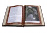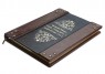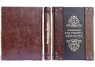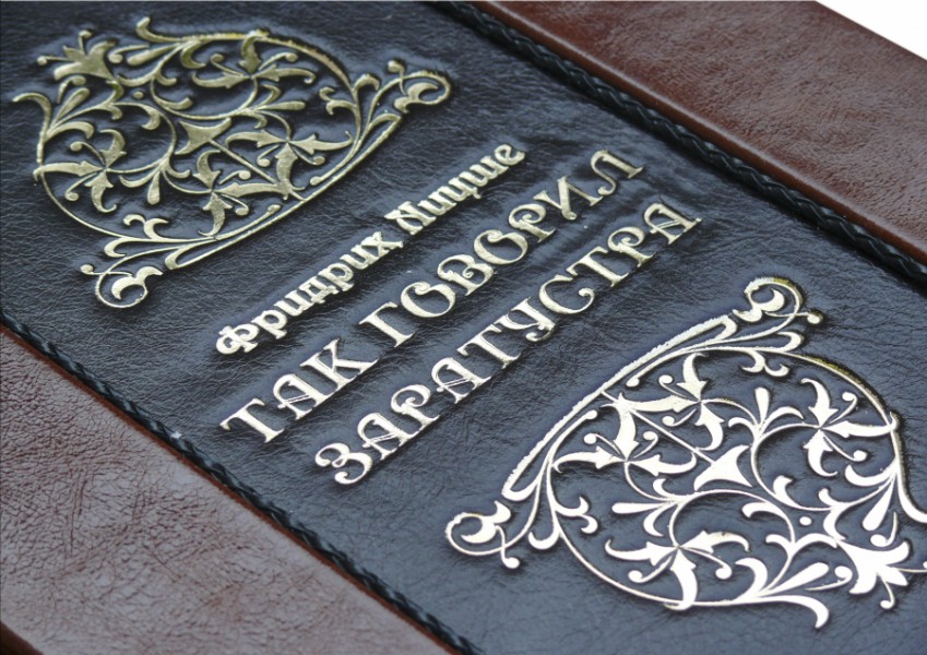 Французька складова палітурка ручної роботи виконана з комбінації натуральної шкіри (шкіра «Laca Nero», шкіра «Robbat Cognac» виробництва італійської шкіряної фабрики «Carisma»). Обкладинка книги дворівнева, оформлена рельєфним золотим тисненням, з використанням фольги "Luxor 240", латунними холітенами (колір "Gold"), кількістю 12 штук, шкіряним шпагатом ручного плетіння. Обріз блоку вручну полірований та позолочений сусальним золотом.