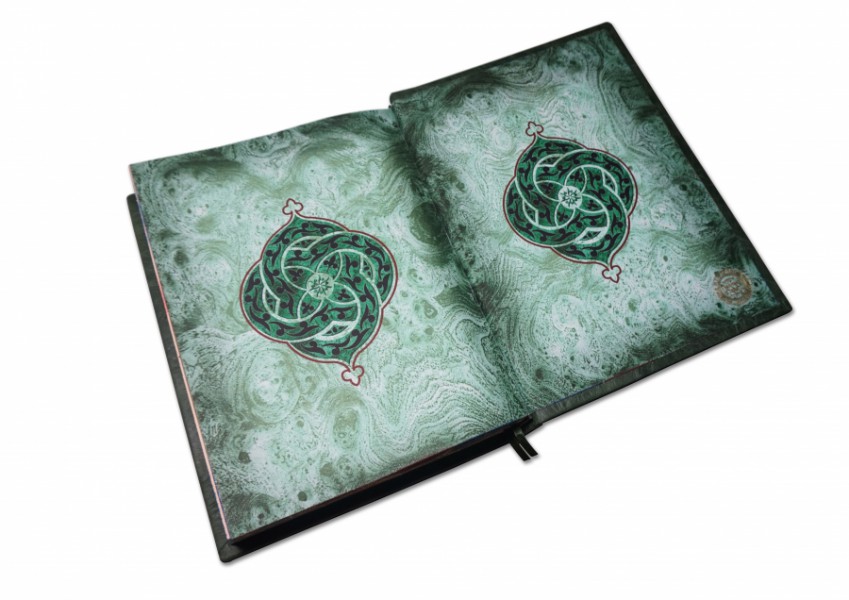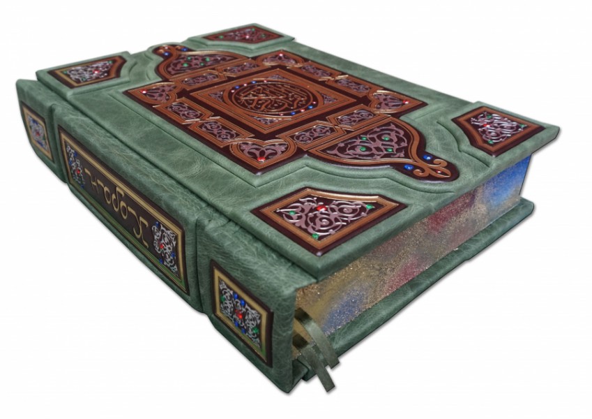 Французька складова палітурка ручної роботи виготовлена з комбінації натуральних шкір (шкіра «Robbat wisky», «Smeraldo» виробництва італійської шкіряної фабрики «Carisma»). Обкладинка багаторівнева, оформлена комбінацією золотого та срібного тиснення, з використанням фольги «Luxor 240». Інкрустована камінням «Swarovski». Обріз книги оформлений унікальною технікою "Хамелеон".