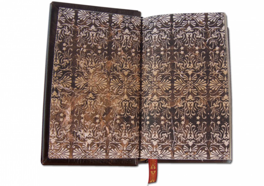 Французька складова палітурка ручної роботи виконана з натуральної шкіри «Perugia brown» виробництва італійської шкіряної фабрики «Claudio». Обкладинка книги оформлена глибоким блинтовим та рельєфним золотим тисненням з використанням фольги «Luxor 240». Обріз книги вручну полірований та позолочений сусальним золотом. Сертифікат Оксамитовий чохол.
