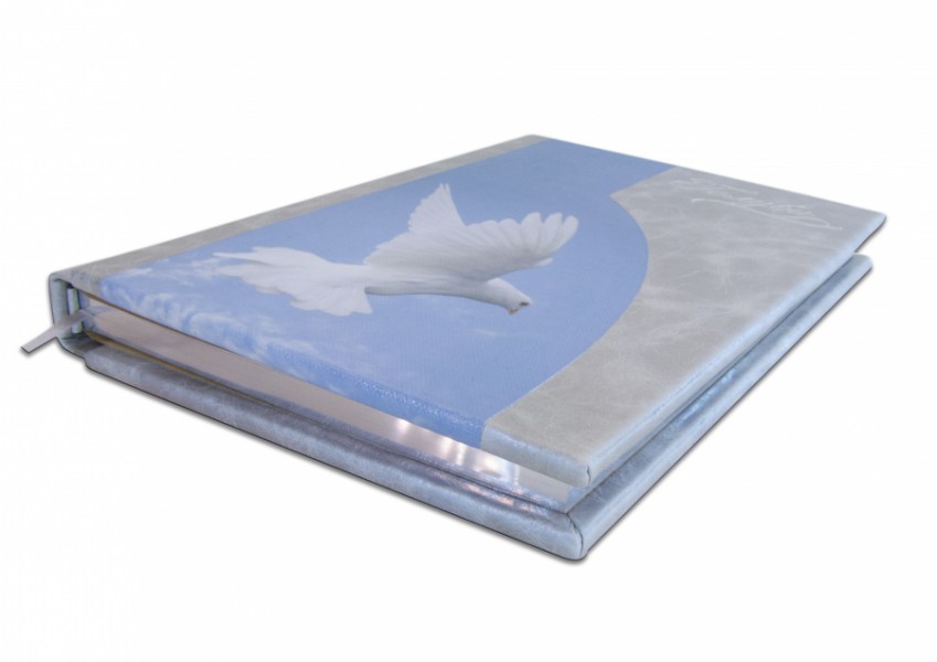 Французька складова палітурка ручної роботи виконана з натуральної шкіри «Metallico» виробництва італійської шкіряної фабрики «Carisma». Обкладинка книги оформлена рельєфним срібним тисненням з використанням фольги «Luxor 240», декорована зображенням на полотні. Обріз блоку вручну полірований і срібний сусальним сріблом.