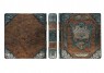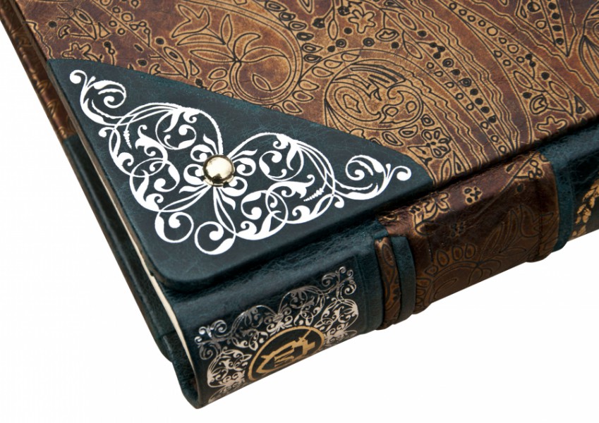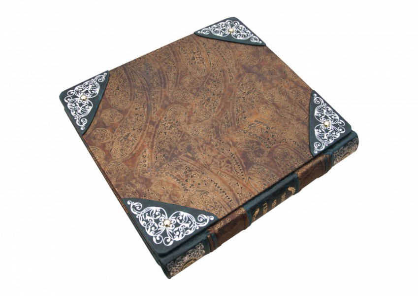 Французька складова палітурка ручної роботи, виконана з комбінації натуральної шкіри (шкіра «racconto bronzo», шкіра «Marma verde» виробництва італійської шкіряної фабрики «Benericetti»). Обкладинка фотоальбому дворівнева, виготовлена в авторській технології високого рельєфу та декорована комбінацією золотого та срібного тиснення, позолоченими ніжками (4 штуки). У комплекті спеціальне постачання, затягнуте в оксамит, оксамитовий чохол та іменний сертифікат (даний надає клієнт). Палітурний тираж – 7 екземплярів.