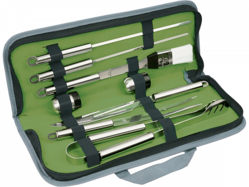 Дуже зручний набір для барбекю розрахований на 2 персони, в набір входять 2 шампури, пензлик, сільничка, перечниця, ніж, вилка, щипці. Набір міститься в компактному чохлі, який у складеному стані не займає багато місця.