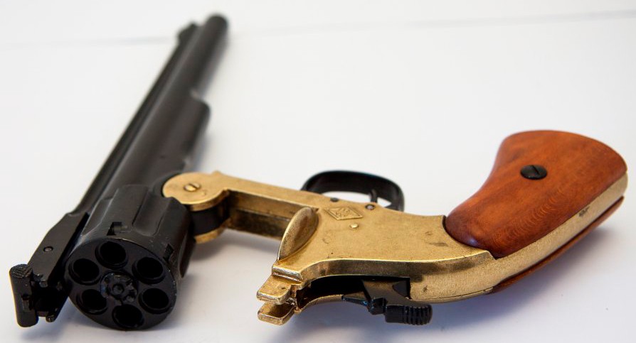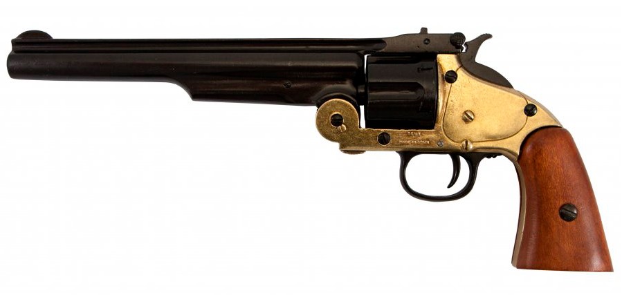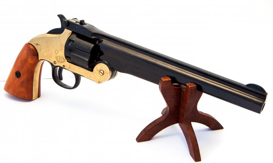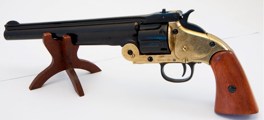 Револьвер, США, 1869 р., Smith & Wesson - неперевершений вибір для людини, яка бажає дізнатися про пістолети ціни і купити пістолет! Цей сувенірний револьвер, створений іспанською фірмою Denix, знаменитою своїм уважним ставленням до деталей сувенірної зброї, яку вони виробляють. Він є точною копією револьвера, виготовленого в 1869 найбільшим виробником вогнепальної зброї в США, компанією Smith & Wesson, заснованої в 1856 Горацієм Сміттом і Денієлом Вессоном!