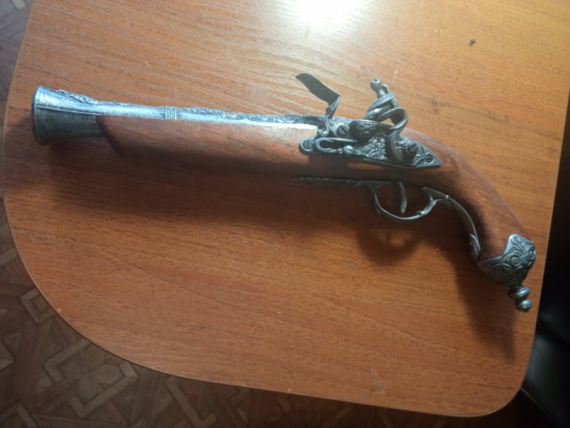 Подарунковий макет англійського пістолета-мушкетону із кремнієвим замком XVIII століття. Виконаний із сталі та дерева, довжина 36 см. Підходить під ліву руку. Цей пістолет у вигляді подарунка не залишить байдужим жодного чоловіка.