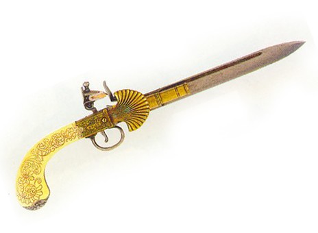 Чудовий подарунок для колекціонера зброї – кремнієвий пістолет-ніж. Висококласна робота англійських майстрів-зброярів позаминулого століття майстерно втілена у сучасній копії. Ця універсальна зброя – і холодна, і вогнепальна. До того ж, пістолет-ніж дивовижно красивий – хитромудрі символи та орнаменти обплітають всю поверхню.