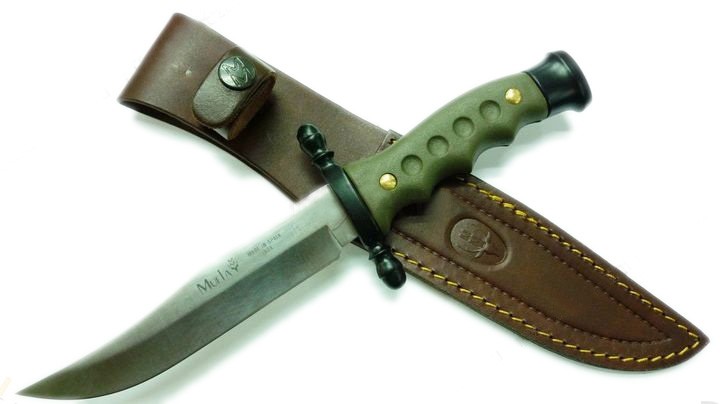 Ніж "Лось" упор чорний, рукоять зелена пластикова, шкіряний чохол. Виробник Muela (Іспанія).