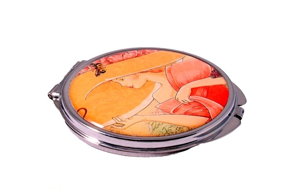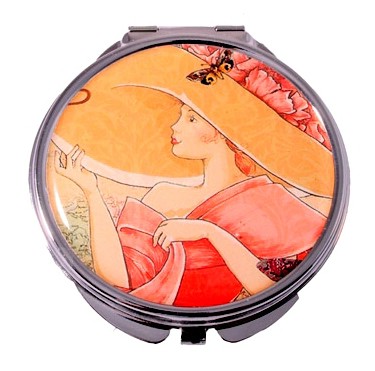 Стильне косметичне дзеркальце "Jardin D`ete". Металевий корпус на лицьовій стороні нанесення із зображенням красива жінка в капелюсі. Тепле забарвлення. Висока якість та оригінальний дизайн зробить цей виріб незамінним атрибутом вашої сумочки!