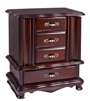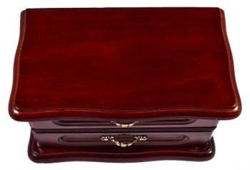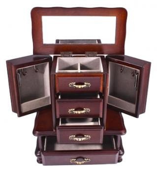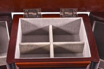 Піднімаючи верхню кришку шафки, на якій розташоване дзеркало, відкривається скринька з 4 відділеннями для дрібних прикрас. Шафа складається з двох висувних скриньок для зберігання дрібних прикрас та одного висувного відділення для середніх та великих прикрас.