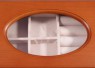 Скринька з відділеннями для зберігання кілець та ланцюжків. На кришці прозоре скло у формі овалу і матовий малюнок квітки троянди.