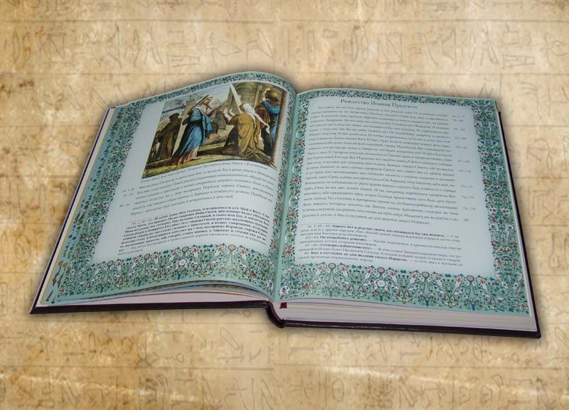 Щодо необхідних пояснень євангельського тексту, то вони прості, досить короткі, доступні читачеві і поміщені під рядком як тлумачення Євангелія. Зрозуміло, що Священна історія викладається за російським текстом Євангелія. Текст друкується за виданням «Священна історія Нового Завіту, викладена за Євангельським текстом» (Москва, 1914) відповідно до граматичних норм сучасної російської мови. Шкіряна обкладинка ручної роботи, виконана з двох сортів шкіри (чорна шкіра сорту Moto Alfredo, Італія; коза «чорний шоколад», Італія) та інкрустований камінням циркон діамантового огранювання загальною кількістю 14 шт., камінням гранат кількістю 4 шт., ski шт.