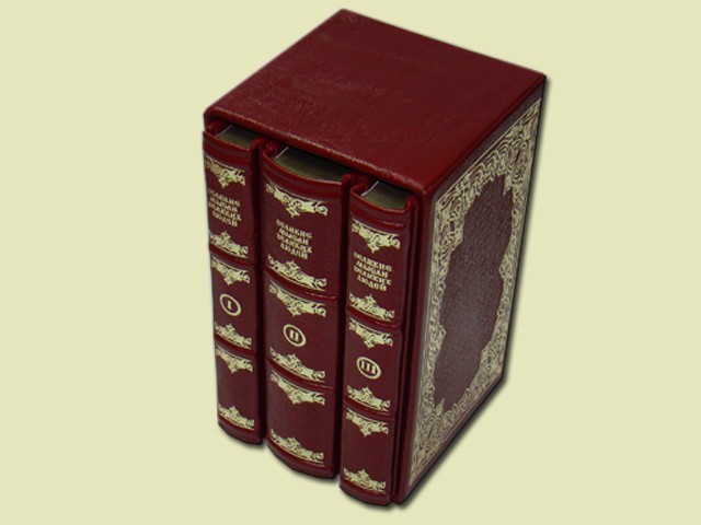 Шкіряна обкладинка ручна виконана з натуральної шкіри «Nataly» Італія. Обкладинка книг і футляр оформлений «сліпим» та золотим тисненням із застосуванням золотої фольги Luxor 234.