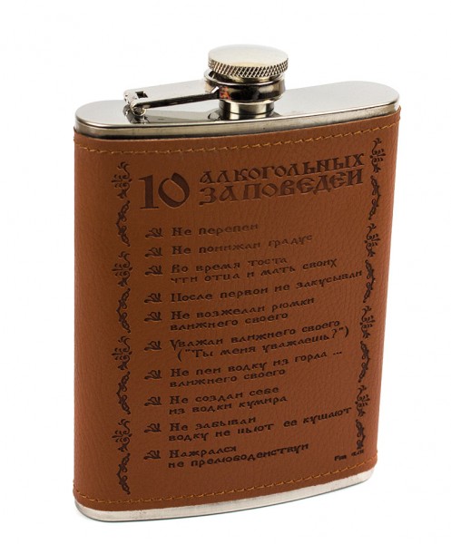 Фляга з нержавіючої сталі обтягнута шкірою 10 Алкогольних заповідей чудовий міні подарунок вашим колегам по роботі чи близьким друзям.