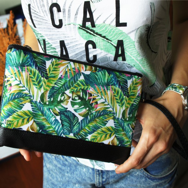 Клатч "Пальмове листя" виготовлений із міцної структурної тканини зі вставкою шкірозамінника під колір принта. Застібка - блискавка, всередині простібана підкладка.
