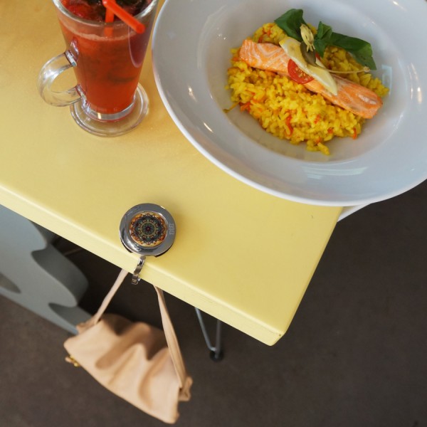 Кріпиться до будь-якої плоскої поверхні – стіл, парта, барна стійка. Витримує до 6 кг. Складається у круглу форму.