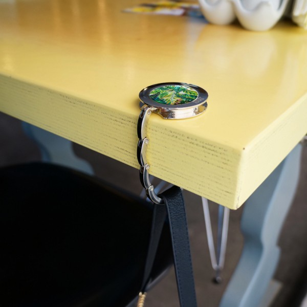 Кріпиться до будь-якої плоскої поверхні – стіл, парта, барна стійка. Витримує до 6 кг. Складається у круглу форму.
