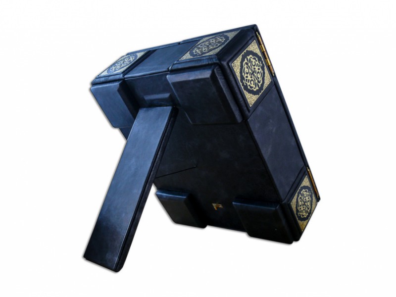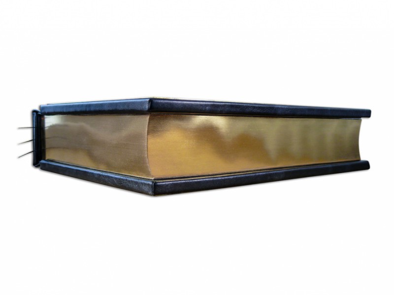Французька складова палітурка ручної роботи виконана з натуральної шкіри «Avrora» виробництва італійської шкіряної фабрики «Carisma». Двохрівнева обкладинка книги та подарунковий футляр оформлені композицією художнього травлення латуні. Складовий форзац з фотодруком, на шкіряній слизурі, декорований золотим тисненням (використано фольгу «Luxor 240»). Обріз книги вручну полірований та позолочений сусальним золотом.