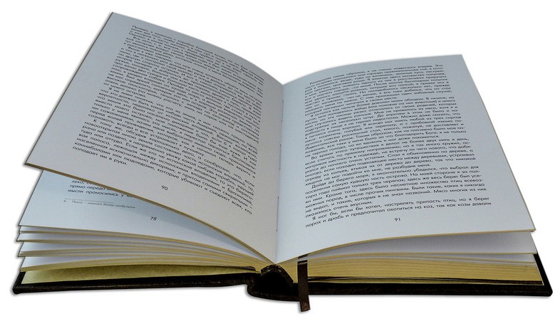 Французька складова палітурка ручної роботи виконана з натуральної шкіри «Perugia Brown» виробництва італійської шкіряної фабрики «Carisma». Обкладинка книги оформлена багаторівневим тисненням: глибоким блінтовим, рельєфним золотим, із золотою фольгою «Luxor 240». Обріз книги вручну полірований та покритий сусальним золотом.