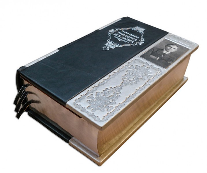 Французька складова палітурка ручної роботи виконана з комбінації натуральних шкір (шкіра «Robbat nero», шкіра «Grigio» виробництва італійської шкіряної фабрики «Carisma»). Обкладинка книги дворівнева, оформлена багаторівневим тисненням: глибоким блінтовим та рельєфним срібним, з використанням фольги «Luxor 240», декорована зображенням на полотні з художнім фотодруком. Обріз блоку вручну полірований і срібний сусальним сріблом.