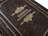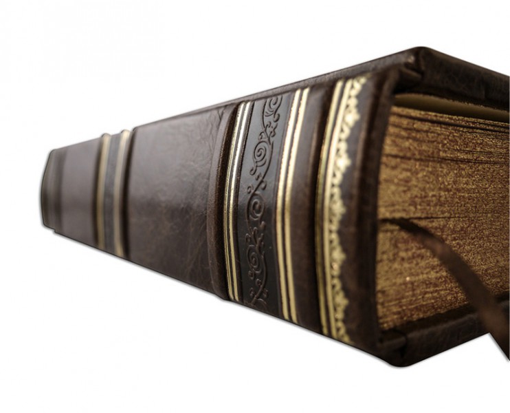 Французька складова палітурка ручної роботи виконана з натуральної шкіри «Gabinetto Brown» виробництва італійської шкіряної фабрики «Claudio». Обкладинка книги оформлена багаторівневим тисненням: глибоким блинтовим та рельєфним золотим із використанням фольги «Luxor 240». Обріз книги вручну полірований та виконаний в унікальній техніці «Хамелеон».