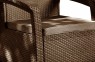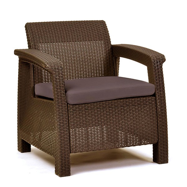 Крісла виконані з пластику, що імітує штучний ротанг у двох кольорах - коричневому та сірому. Більше того, ви зможете купити декоративне кашпо, скриню, і все це буде виконано в одному стилі.